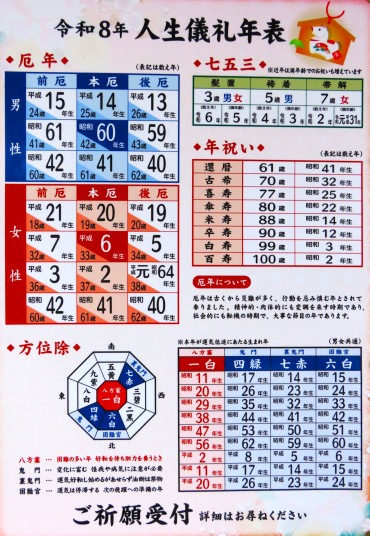 厄年・方除け・算賀(還暦〜白寿)の方の厄除け及び健康長寿を御祈願致します。